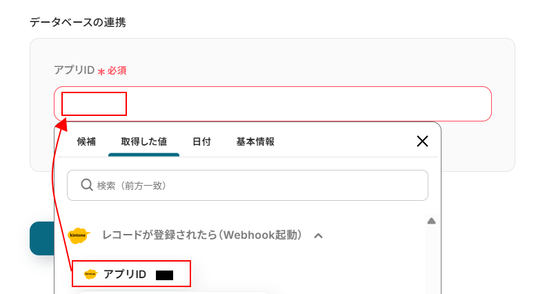 取得した値は入力欄をクリックし、取得した値タブから選択できます。