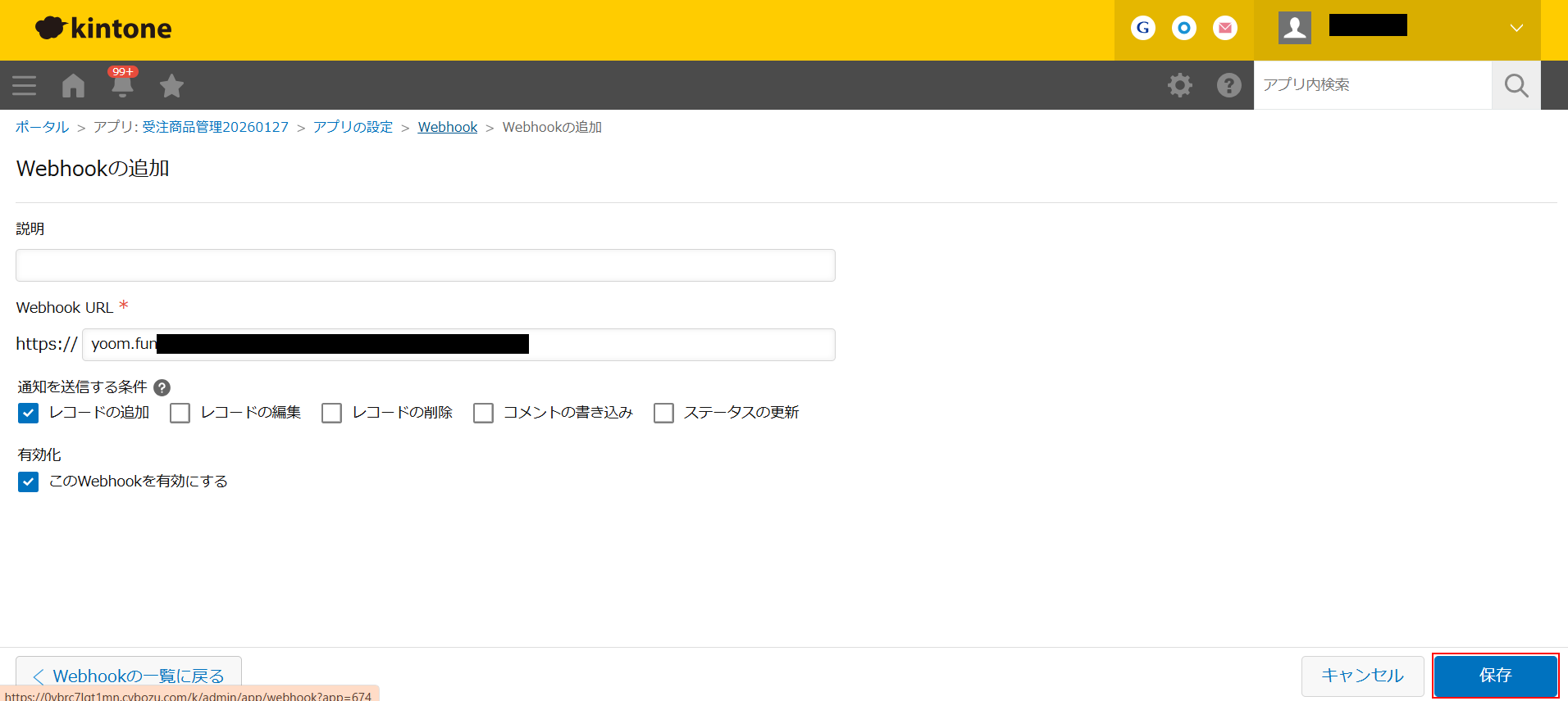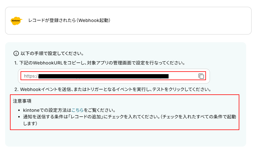 WebhookURLをコピーしたら、kintoneの連携したいアプリのページを開き、以下のリンク先を確認しながらWebhookの設定を行いましょう。