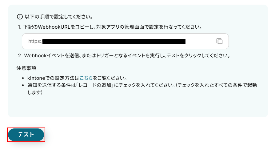 ここまで設定できたらYoomの画面に戻り、テストをクリックします。