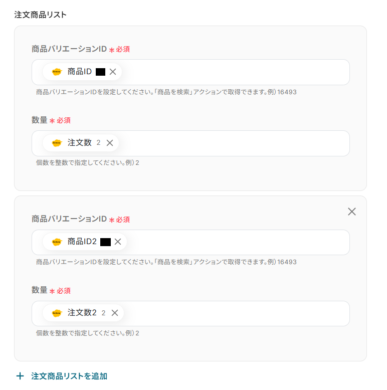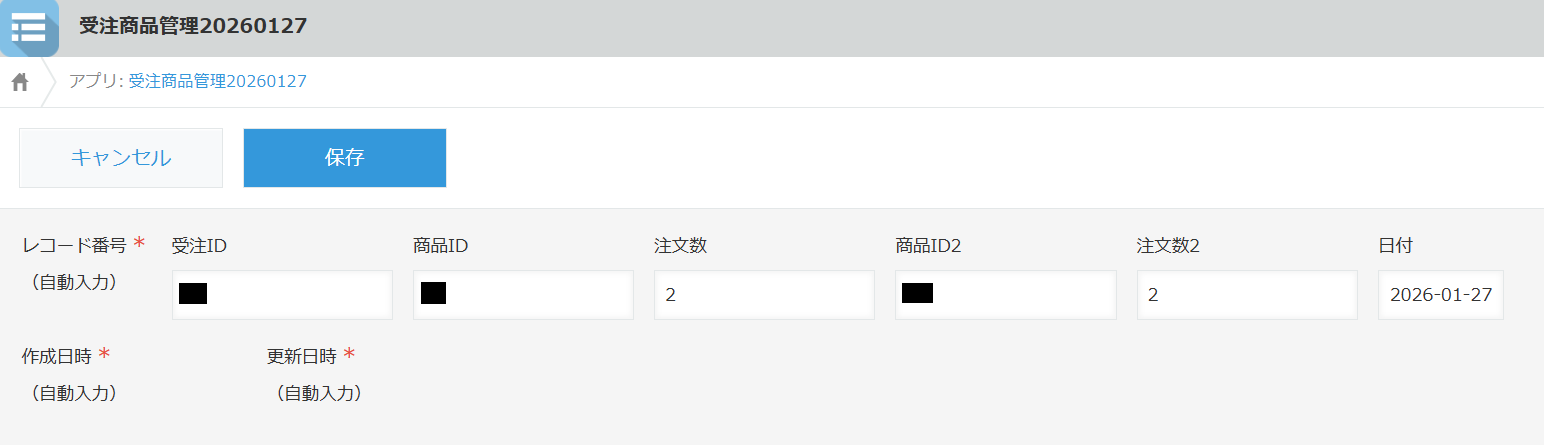 また、追加したい商品数に合わせてkintoneのアプリにも、名称に注意しながら商品IDと数量を追加してください。