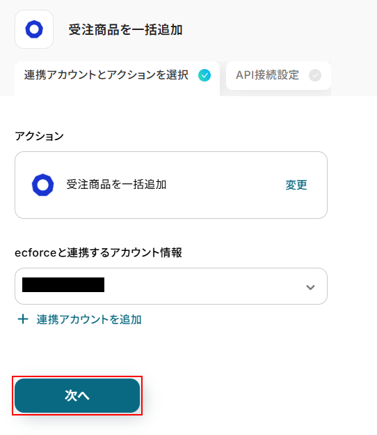 - 最後に、オペレーションでecforceを選択し、「受注商品を一括追加」アクションを設定し、kintoneから取得した情報をもとに商品を追加します。