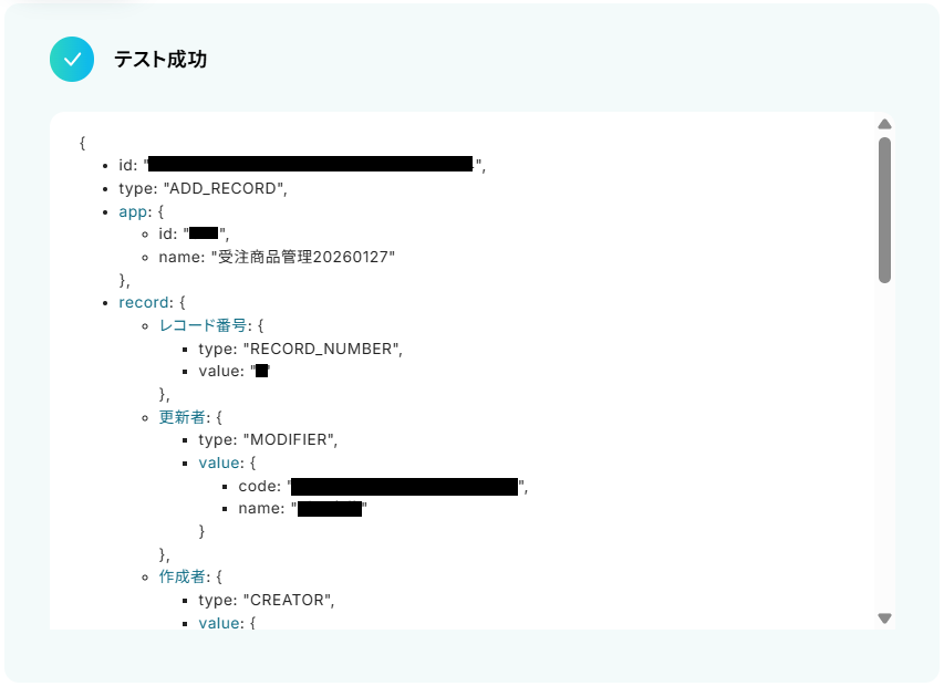 続いて取得した値が表示されますが、以下のようにkintoneに登録したものと名称が違う場合があります。