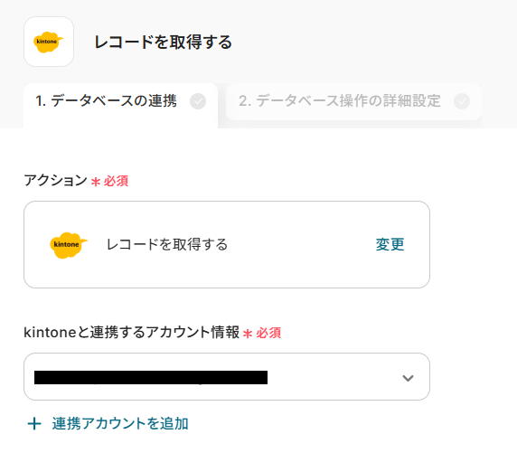 - 次に、kintoneで「レコードを取得する」アクションを設定し、登録されたレコードの情報を取得します。