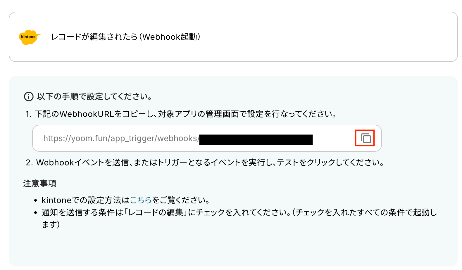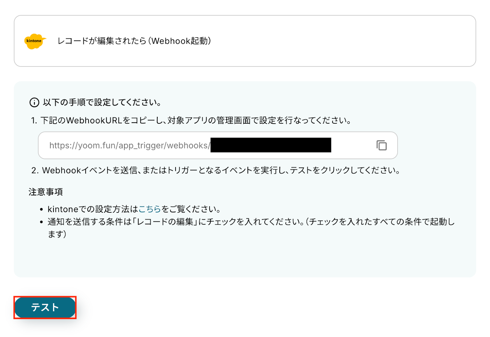 この設定により、レコードの登録といったイベントが発生した際に、その内容がWebhook経由で自動的に通知され、Yoom側で処理を開始できるようになります。