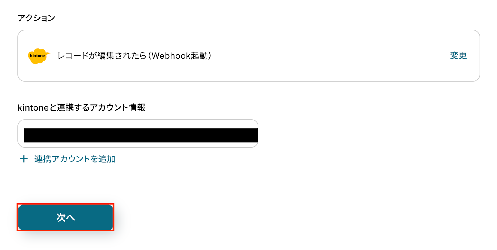 kintoneと連携するアカウント情報に問題がなければ、「次へ」をクリックします。