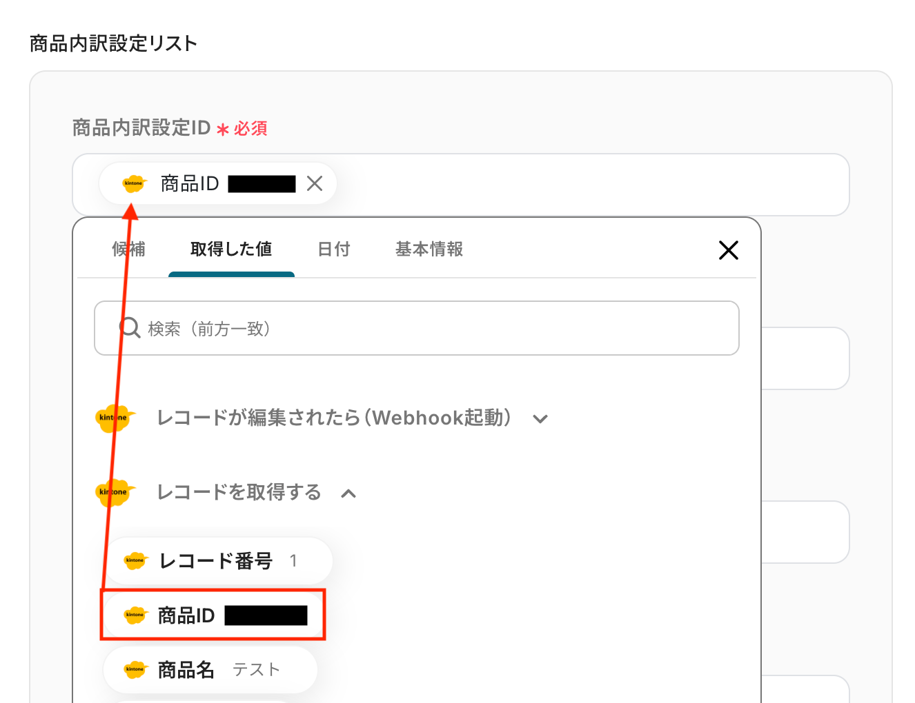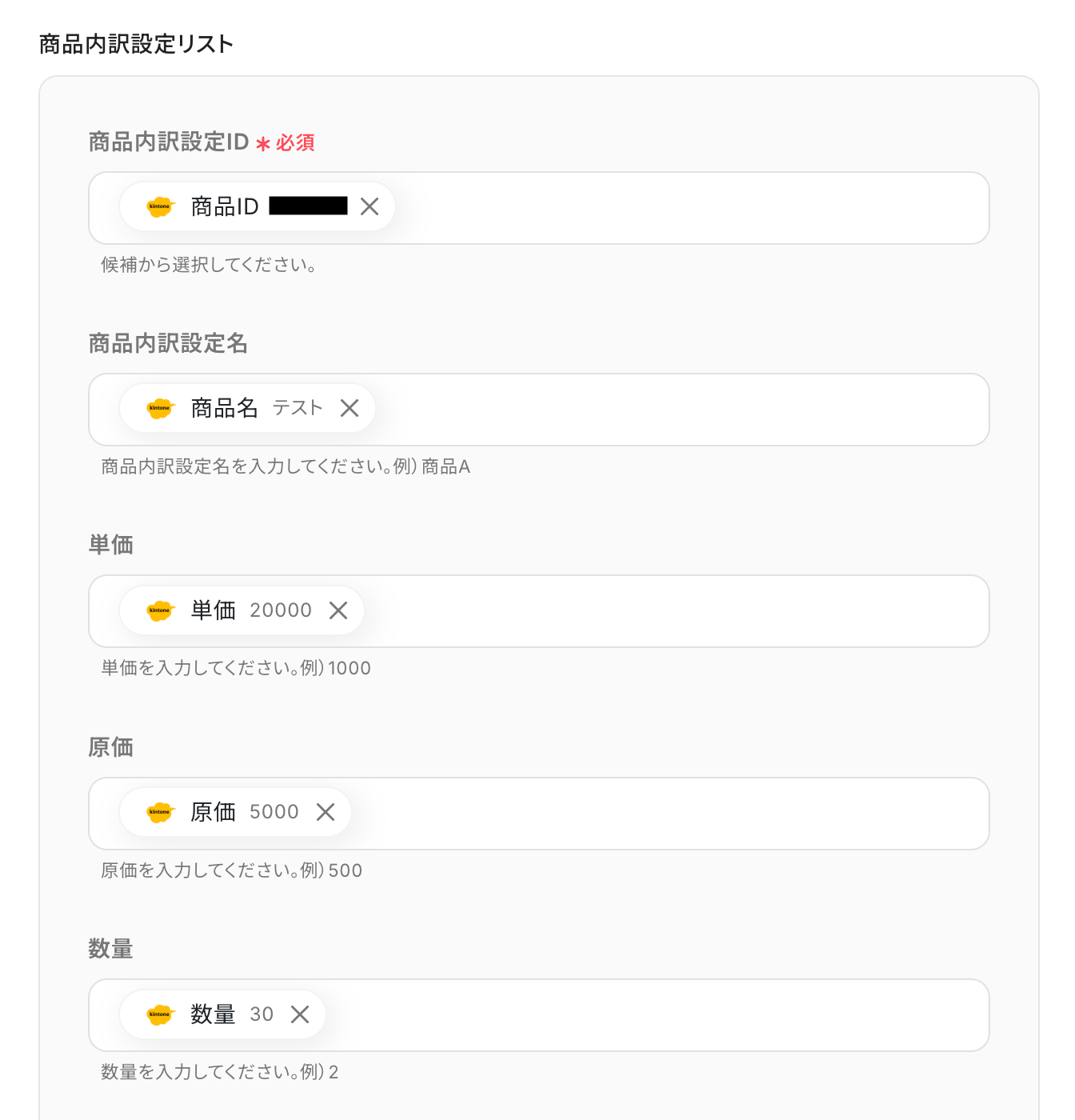 続いて、前のステップでkintoneから取得した値を利用して、Mazricaで商品内訳設定の更新を行いましょう。