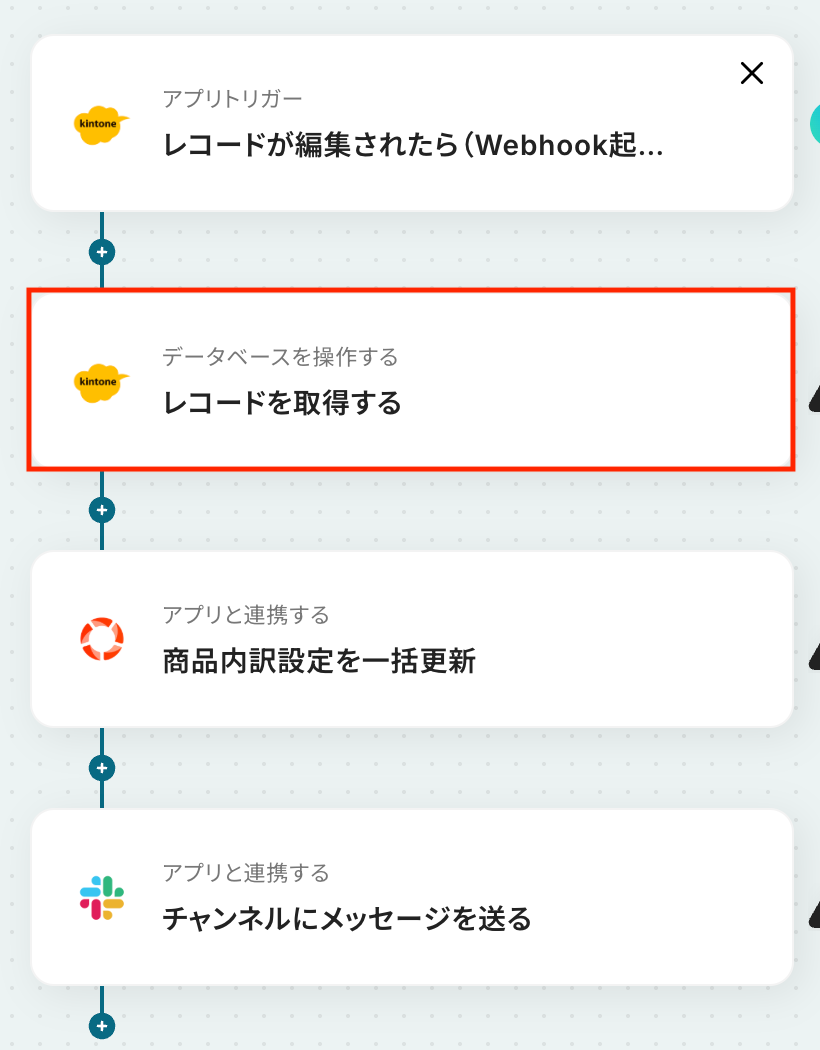 続いて、トリガーのステップで取得したレコード情報をもとに、レコードの詳細情報を取得する設定を行いましょう。