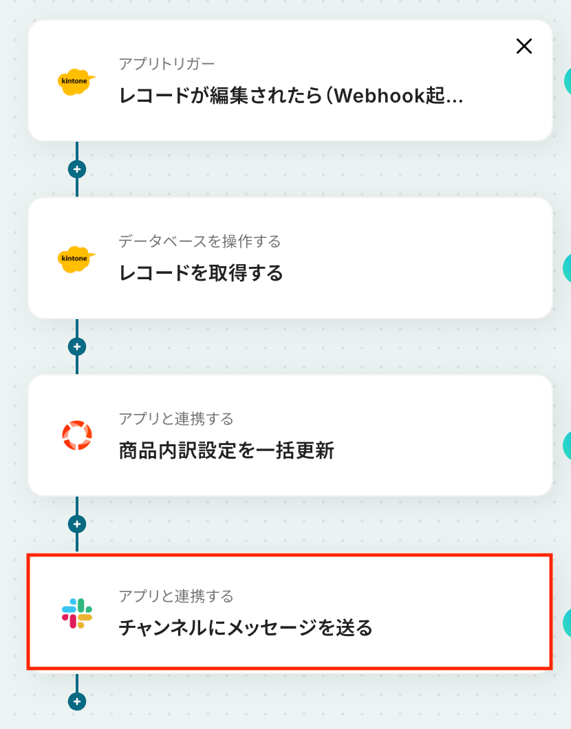 トリガーをONにすることで、kintoneでレコード情報が編集されたことをきっかけに、Mazricaに登録されている商品内訳設定を一括更新し、その内容をSlackに通知できるようになります。