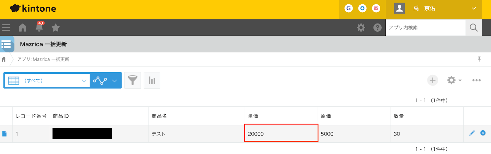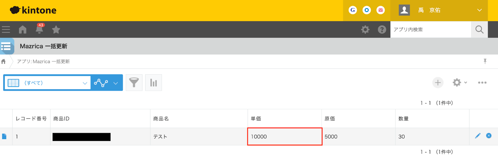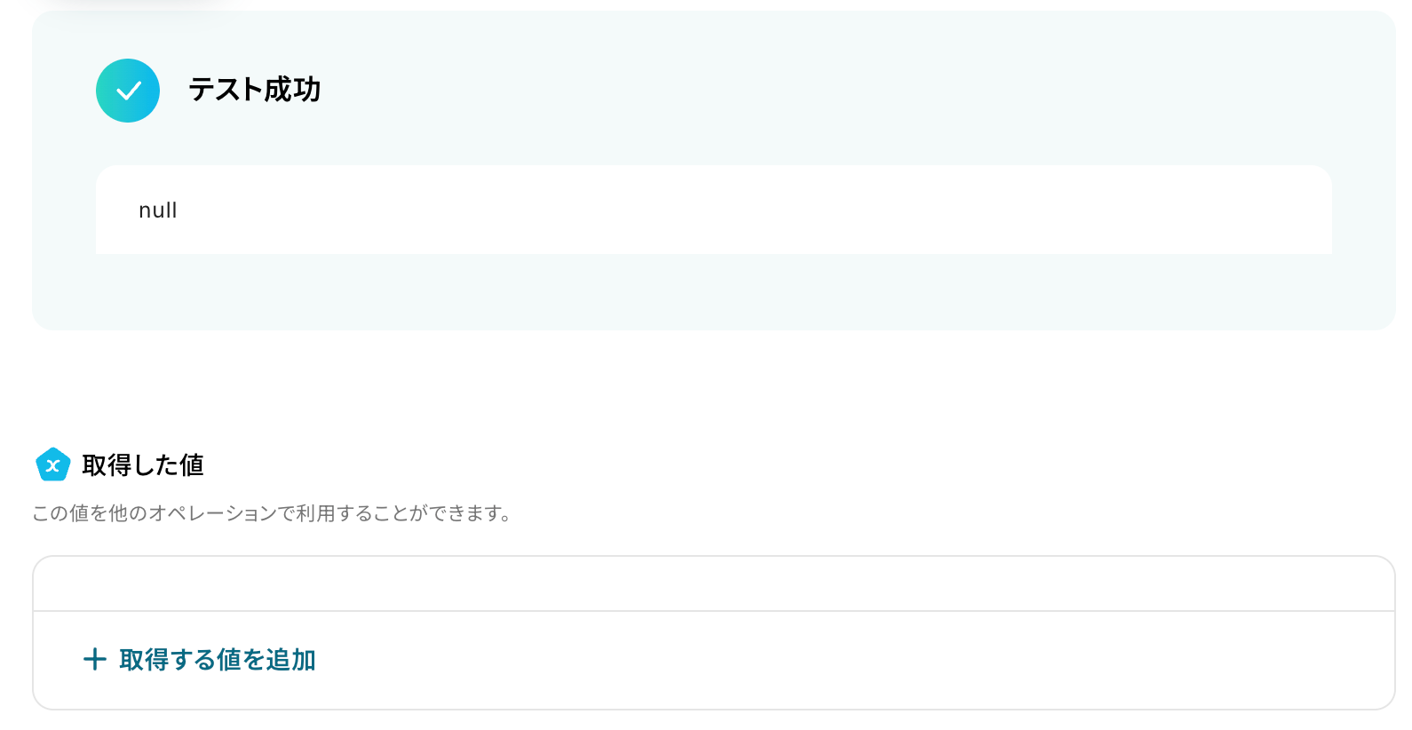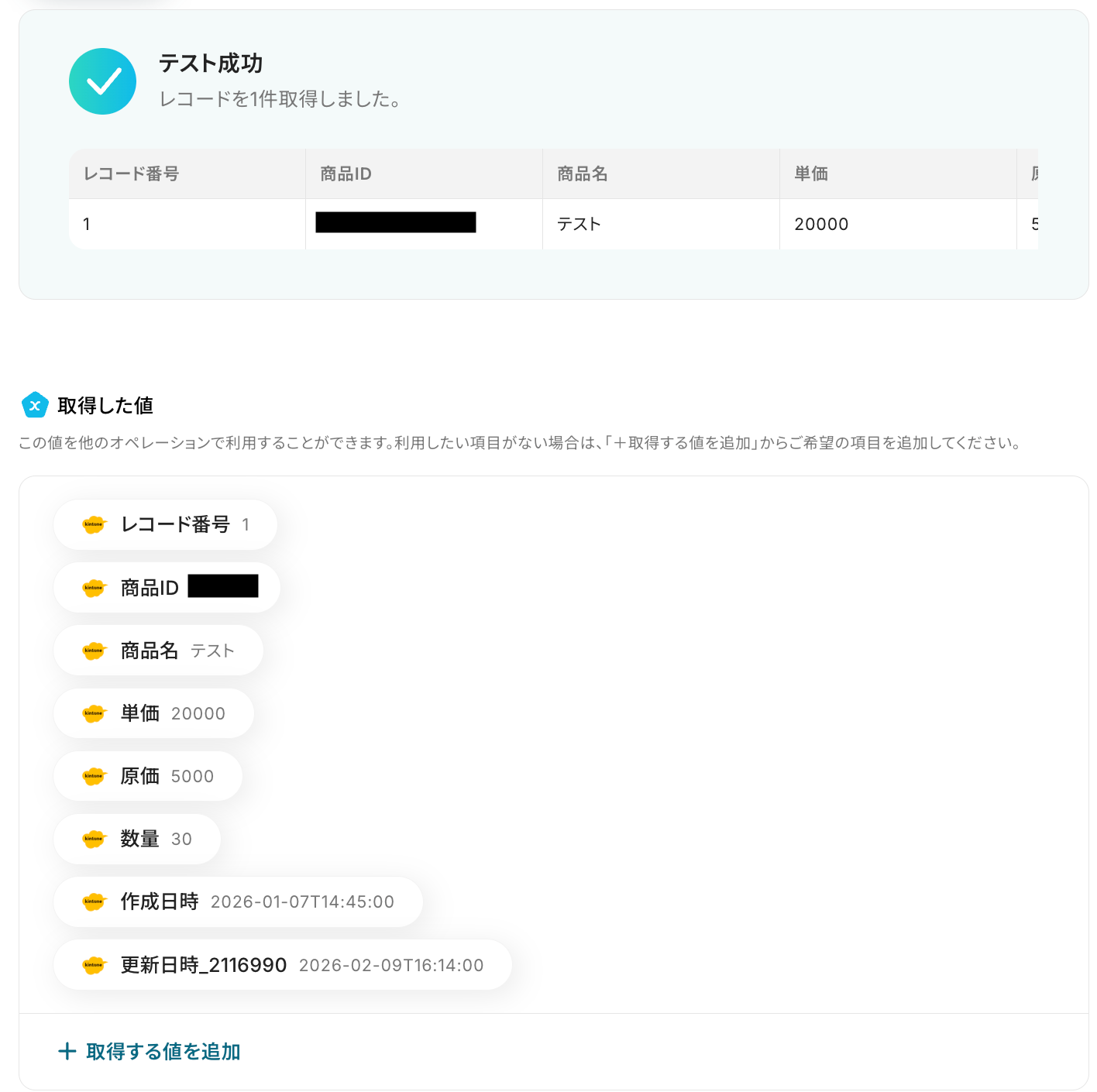 テストに成功すると、条件として設定したレコードの情報が取得されます。