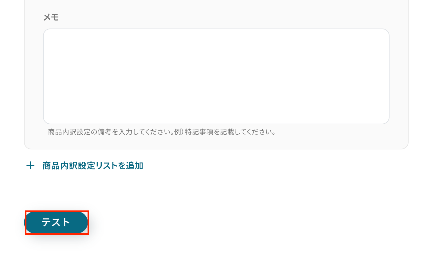 必要な項目について入力が完了したら「テスト」をクリックして、設定した内容でMazricaで商品内訳設定が更新されるか確認しましょう。