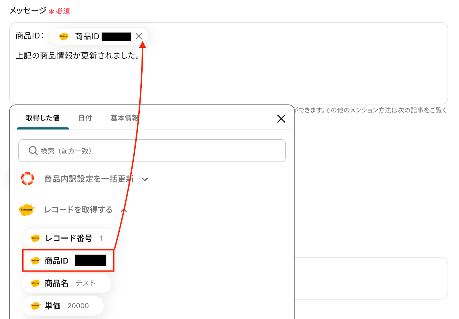 入力欄をクリックすると、前のステップでkintoneから取得した値が表示されるため、該当する値を選択して入力します。