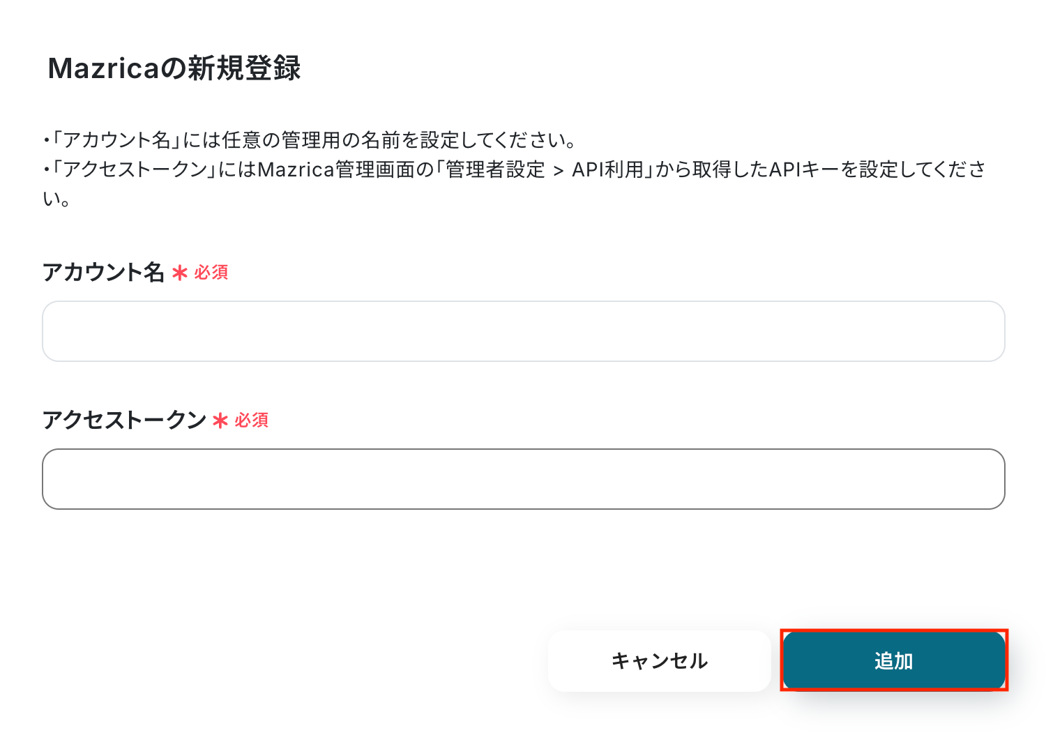 以下の画面が表示されるので、アカウント名とアクセストークンを注釈に沿って入力し、「追加」をクリックしましょう。