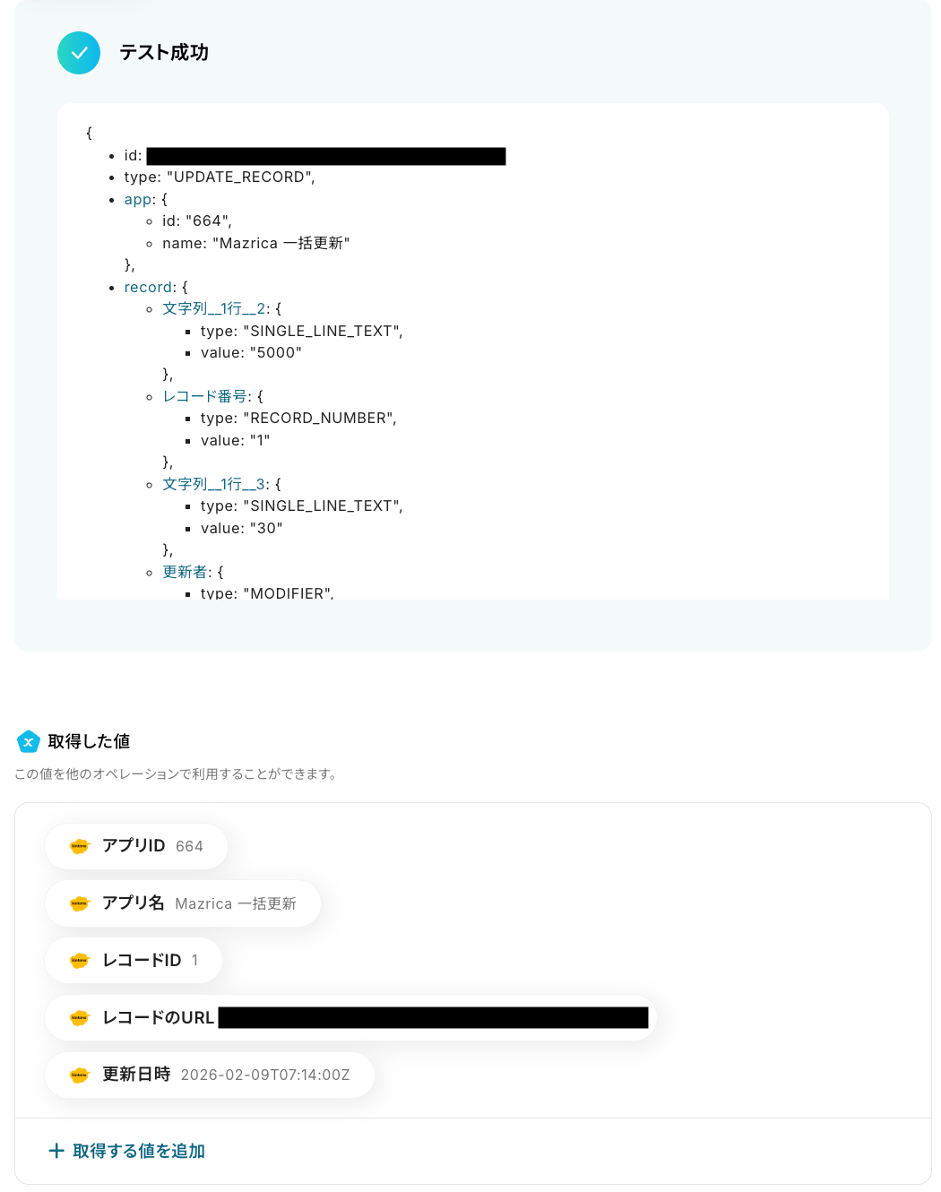 テストに成功すると、kintoneで編集されたレコード情報が表示されます。