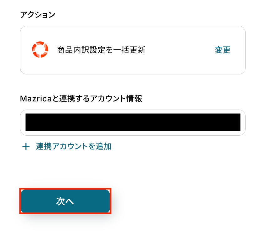 Mazricaと連携するアカウント情報に問題がなければ、「次へ」をクリックします。