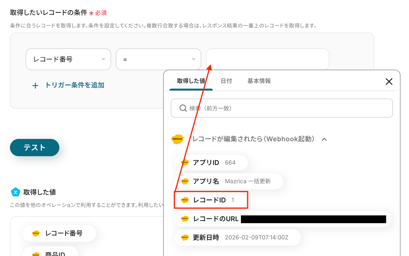入力が完了したら「テスト」をクリックして、設定した内容でレコードが取得されるか確認しましょう。