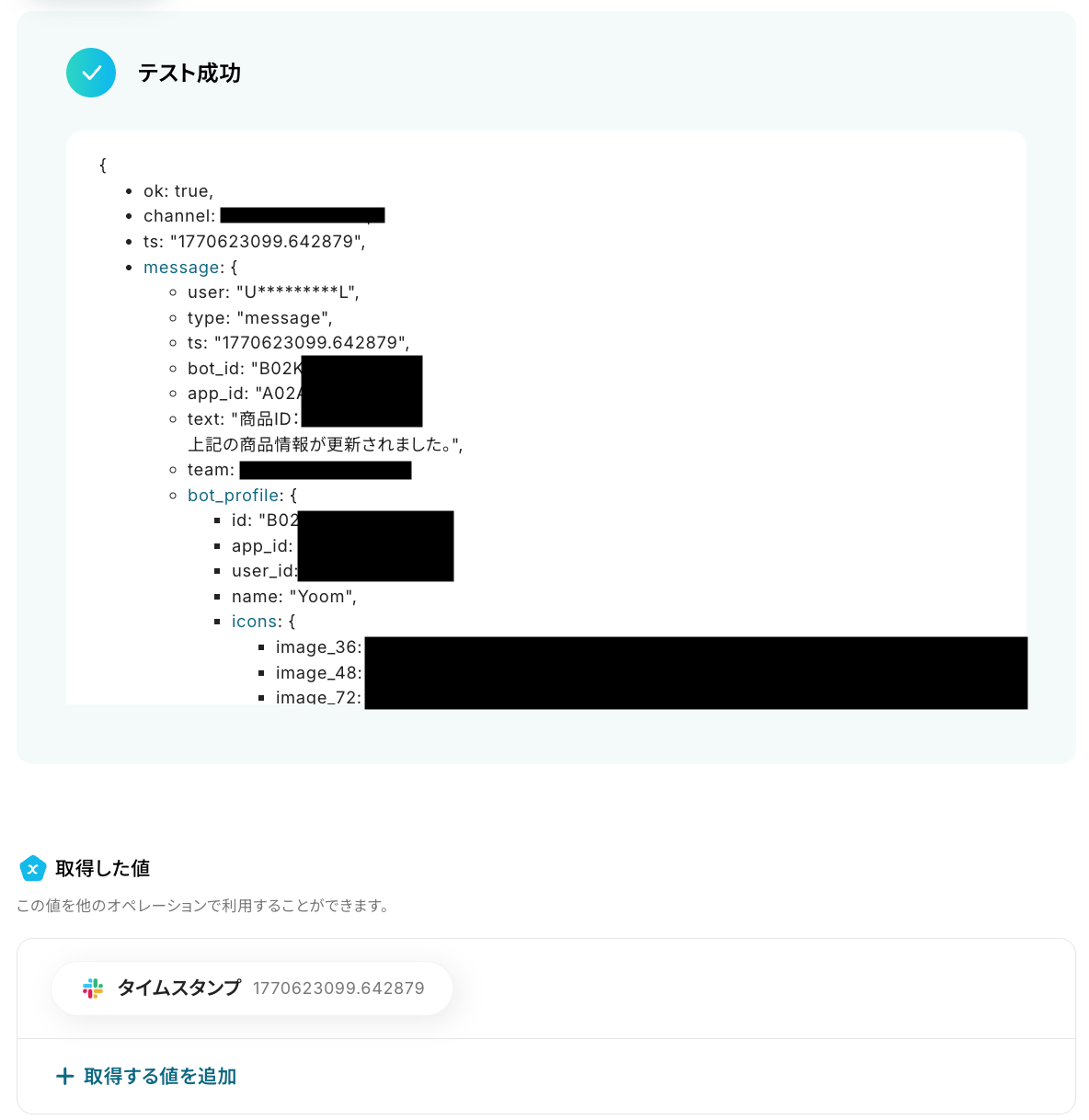 前のステップで取得した値を利用して、Slackで商品情報の更新を通知しましょう。