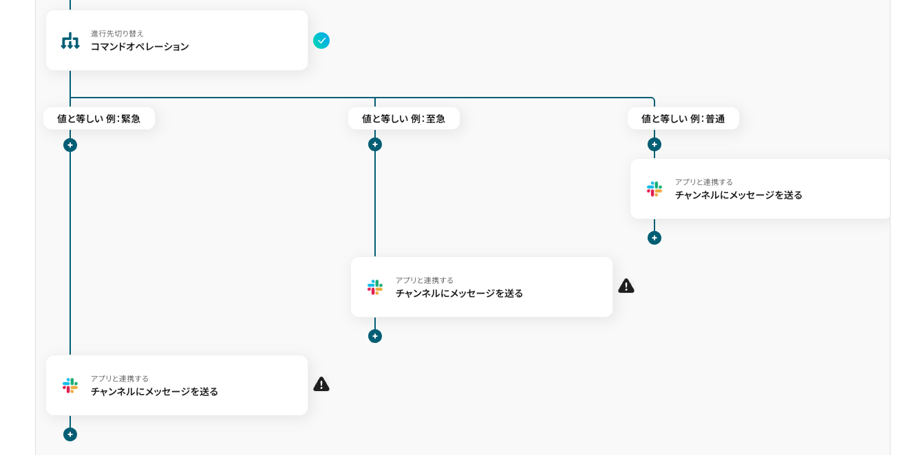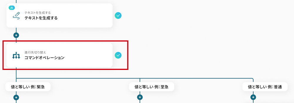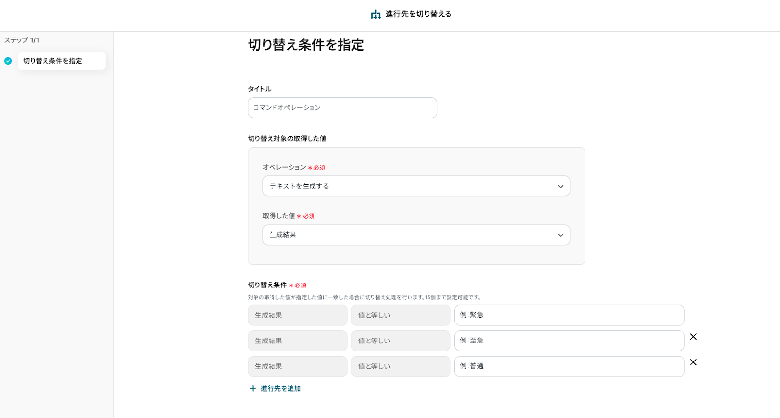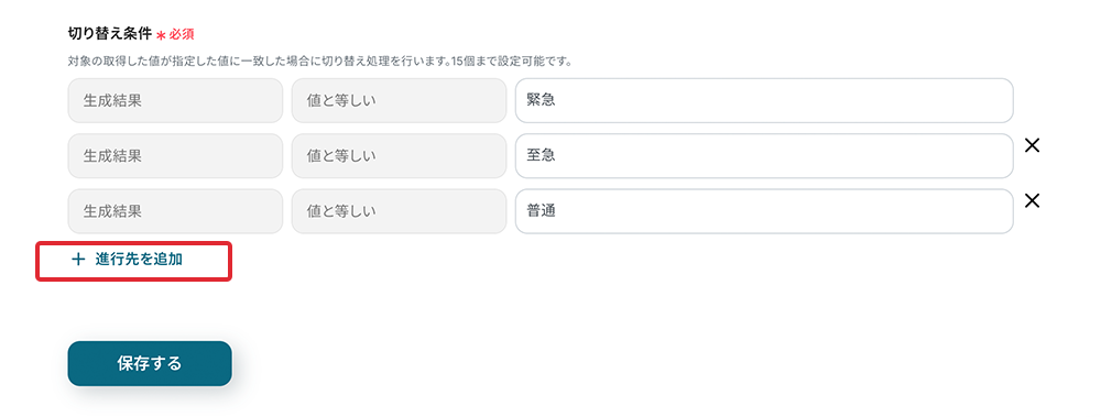 - 今回は「緊急」「至急」「普通」で設定されています。他に条件を追加する場合は、下の「+進行先を追加」ボタンから、条件を増やすことが可能です。