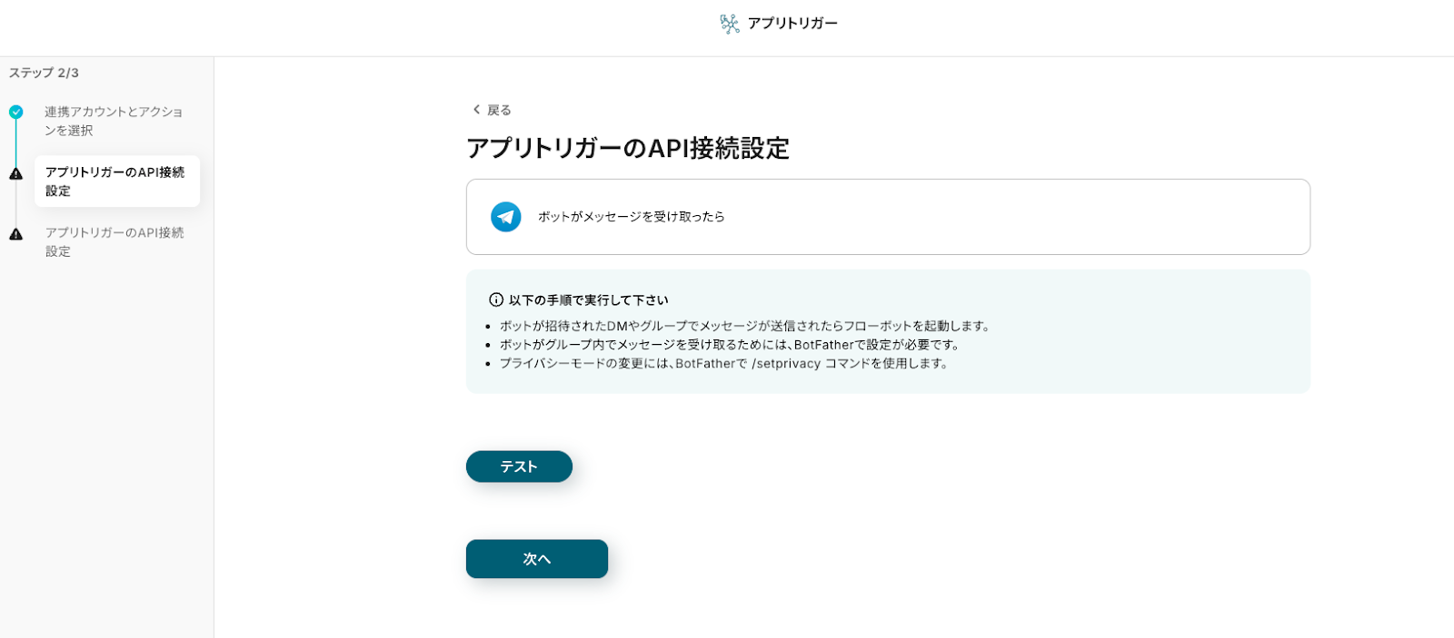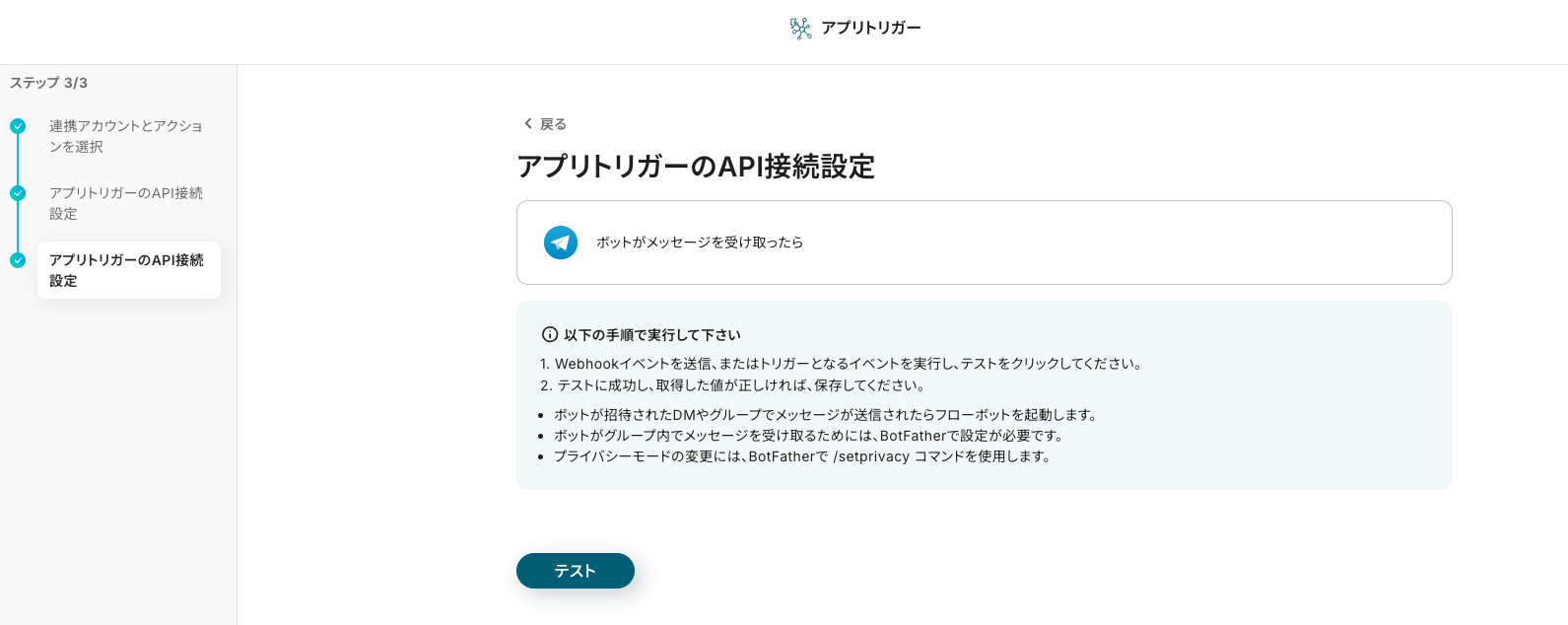 Telegramのボットにテスト用のメッセージを送ってみましょう。これが「トリガーとなるイベント」に該当します。