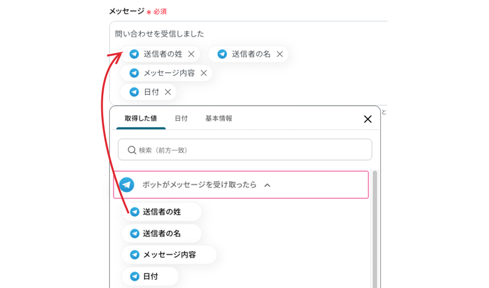 - また、編集欄をクリック<プルダウンメニュー<ボットがメッセージを受け取ったら タブの中に引用コードが格納されています。クリックしたら、編集欄に動的コードとして埋め込みが可能です。