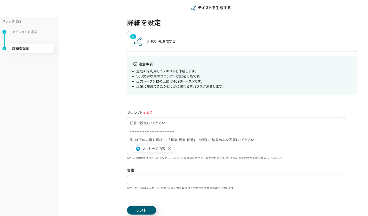 テンプレートの2つ目をクリックします。この工程では、TelegramのメッセージをAIが読み込んで緊急の度合いを判別します。これは、次の分岐の条件になります。