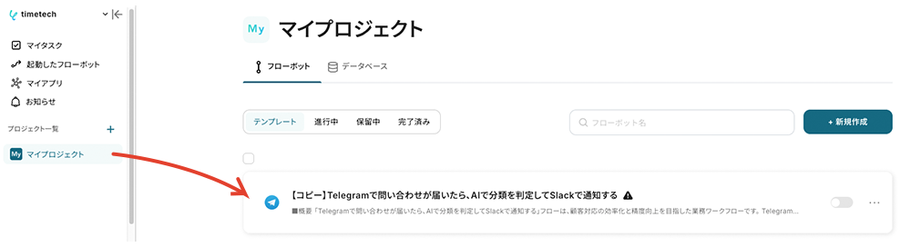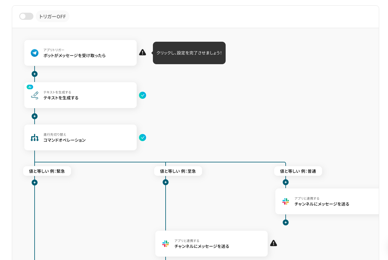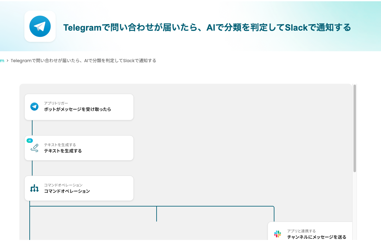 ここでは、数あるテンプレートの中から「Telegramで問い合わせが届いたら、AIで分類を判定してSlackで通知する」フローを例に、設定手順を解説します。
