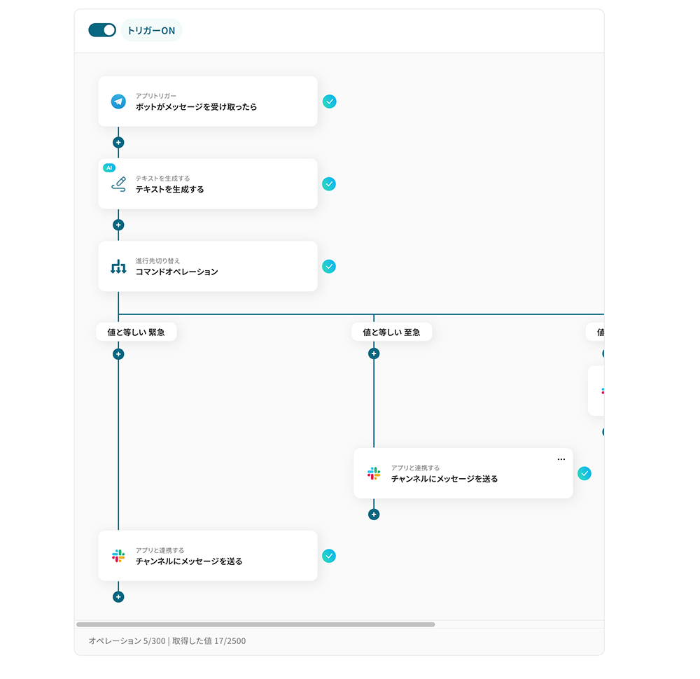 この自動化により、Telegramに来た問い合わせ内容をAIが判断し、適切なSlackチャンネルへ通知。担当者への迅速な情報共有が可能になります!