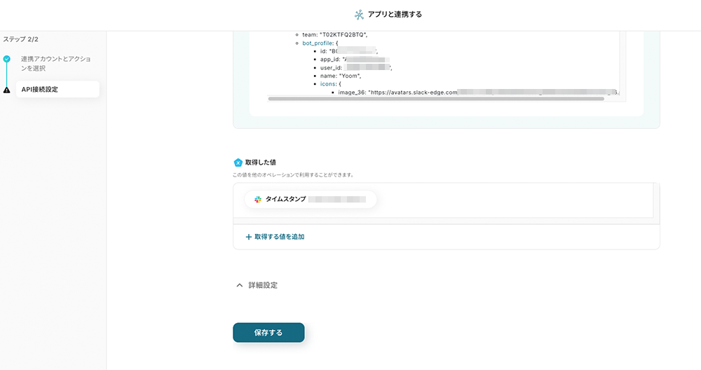 編集が終わったら、テストボタンをクリックします。成功すると、Slackのチャンネルで通知が確認できます。また、タイムスタンプを取得できます。