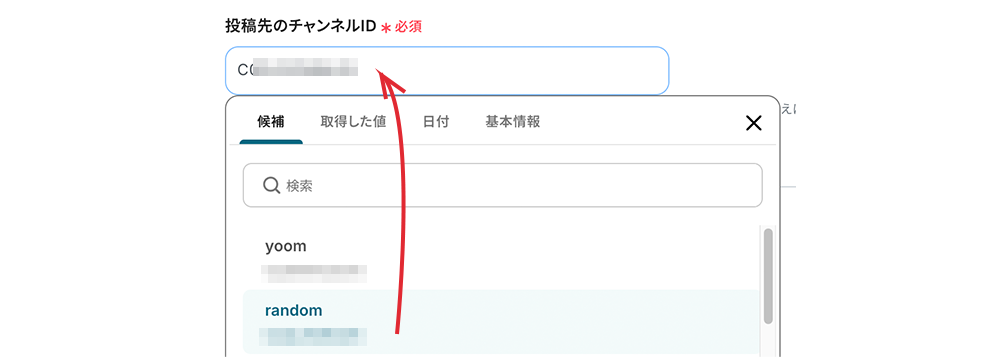 - 編集欄をクリックすると、連携したアカウントが閲覧できるチャンネル一覧が表示されます。チャンネルを選択するとIDが引用されます。