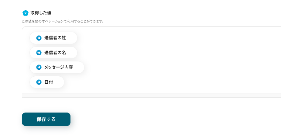- 取得した値:こちらも追加操作は不要です。選択できる項目は以下です。