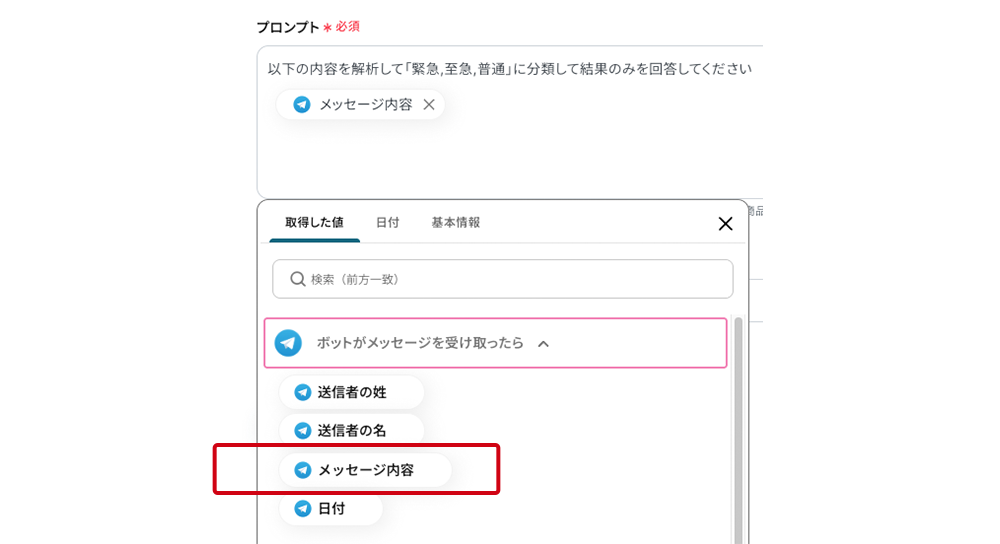 - AIへの指示文の編集画面です。事前設定で、緊急の度合いを判別するように設定しています。この「メッセージ内容」の引用コードは、編集欄をクリックして表示されるプルダウンメニュー内に格納されています。