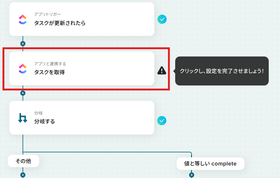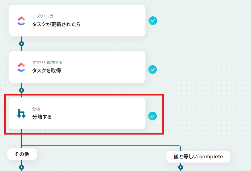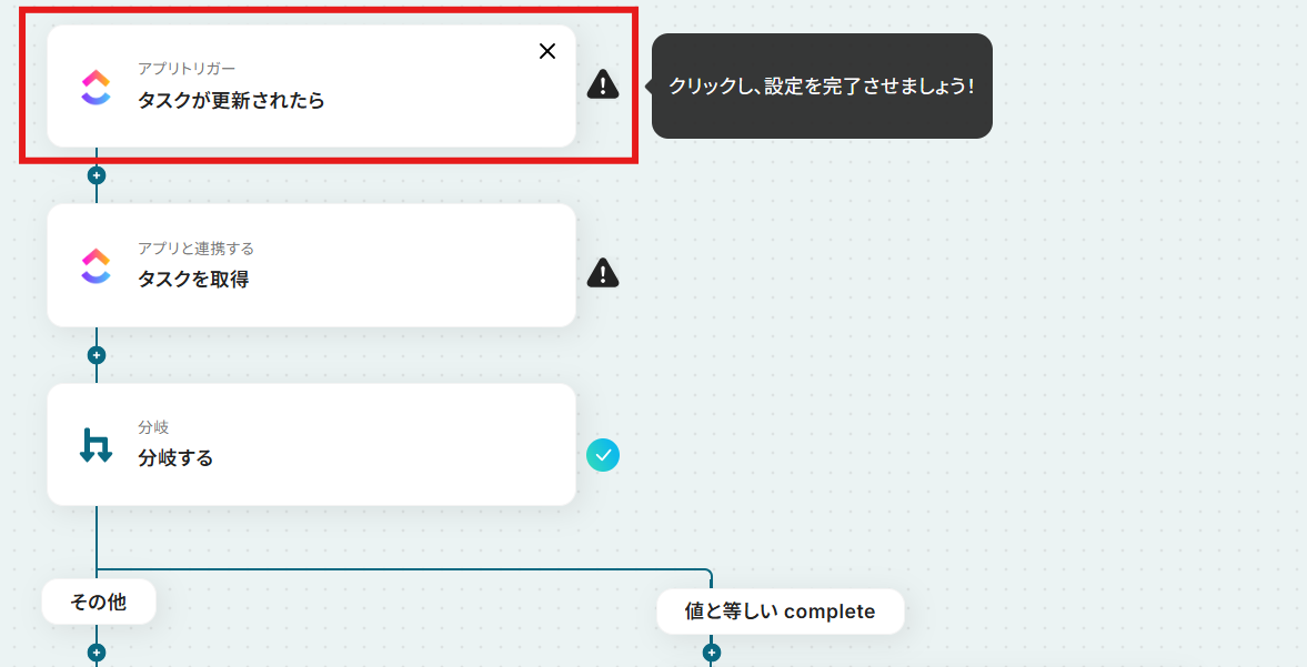 今回はClickUpでタスクが完了したか否かで分岐させるフローですので、デフォルトで以下のように設定されています。