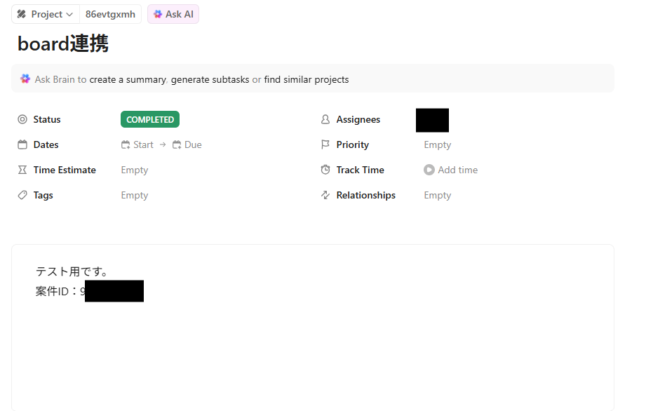 - 事前に、ClickUpのタスクにboardの案件IDを記載しておいてください。