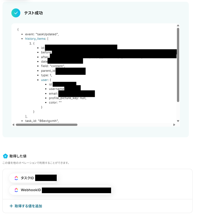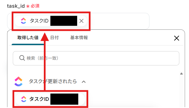 - 続いて、オペレーションでClickUpの「タスクを取得」アクションを設定し、更新されたタスクの詳細情報を取得します。