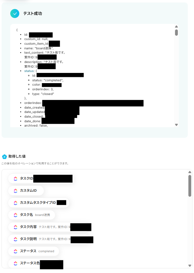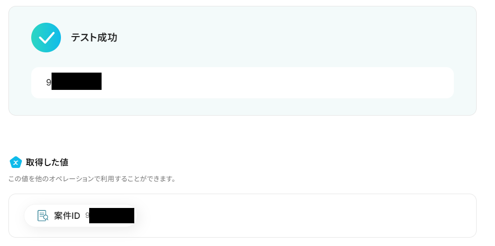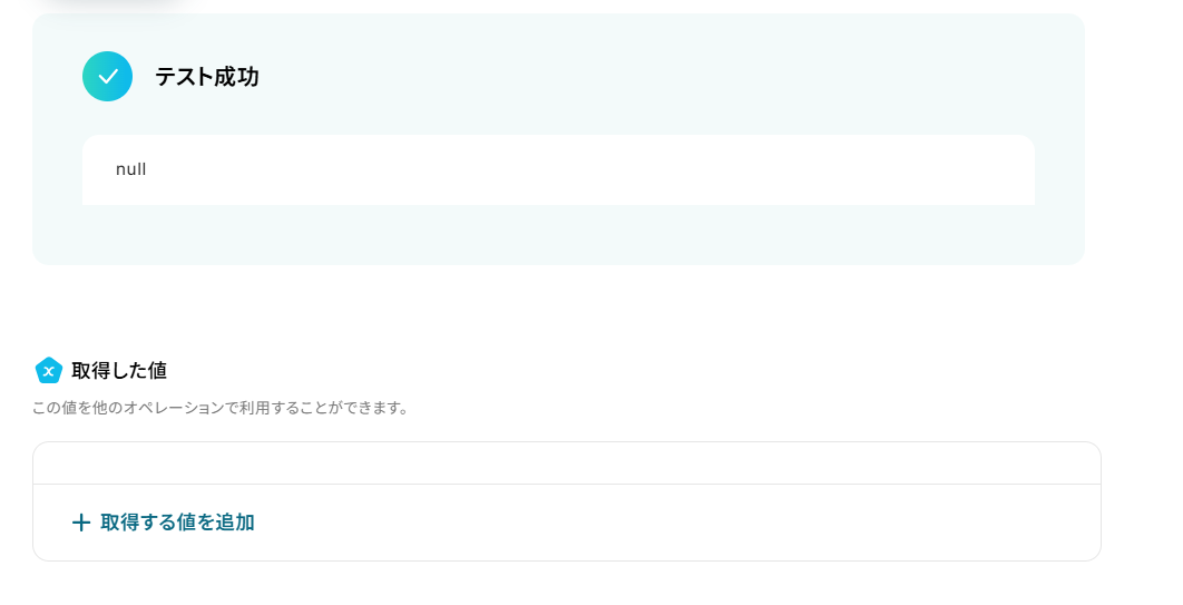 テストに成功すると「取得した値」に反映されます。詳しくは以下をご覧ください。