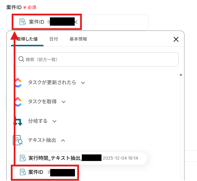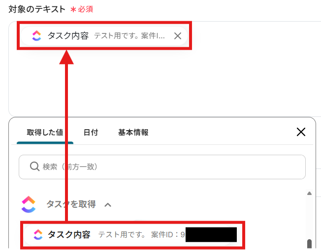 抽出したい「対象のテキスト」を「取得した値」から設定しましょう。