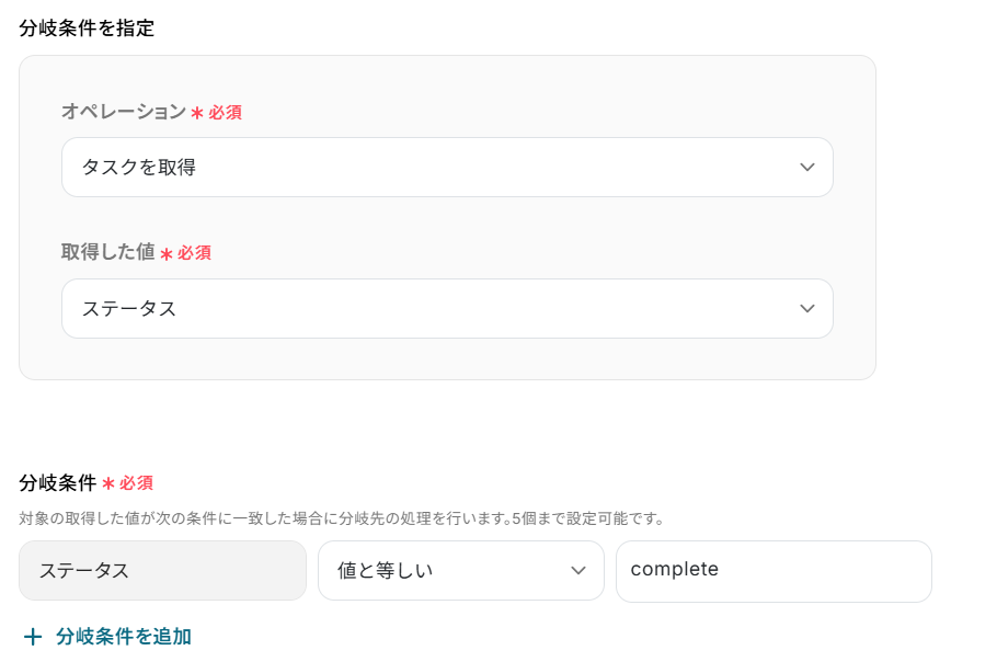 - 次に、オペレーションで分岐機能を設定し、タスクが「complete」ステータスになった場合のみ後続の処理に進むようにします。