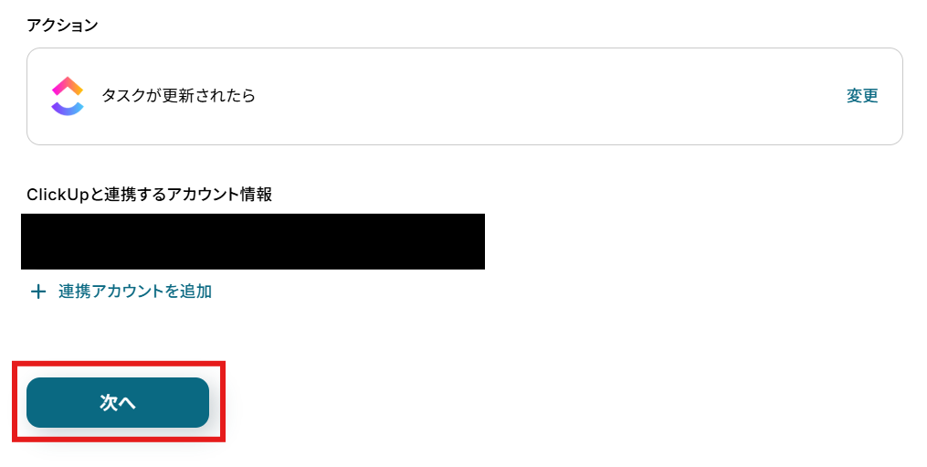「ClickUpと連携するアカウント情報」を確認し、「次へ」をクリックして進んでください。