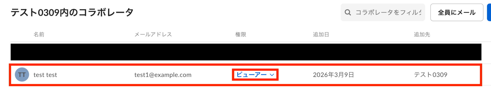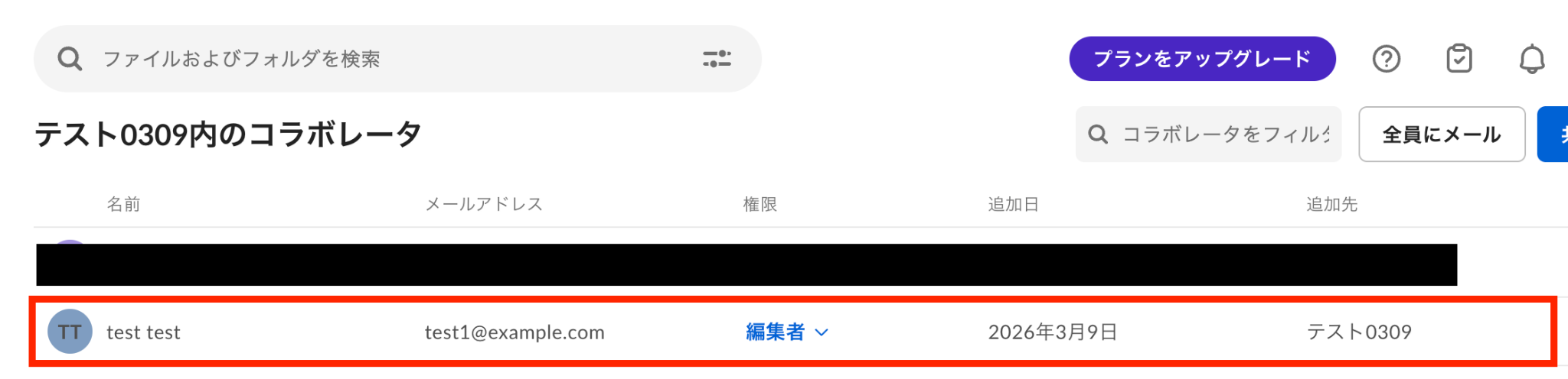 今回は下の画像の通り、Boxでテスト用のフォルダを作成した上でコラボレーター権限を付与したユーザーを作成しました!(赤枠部分)