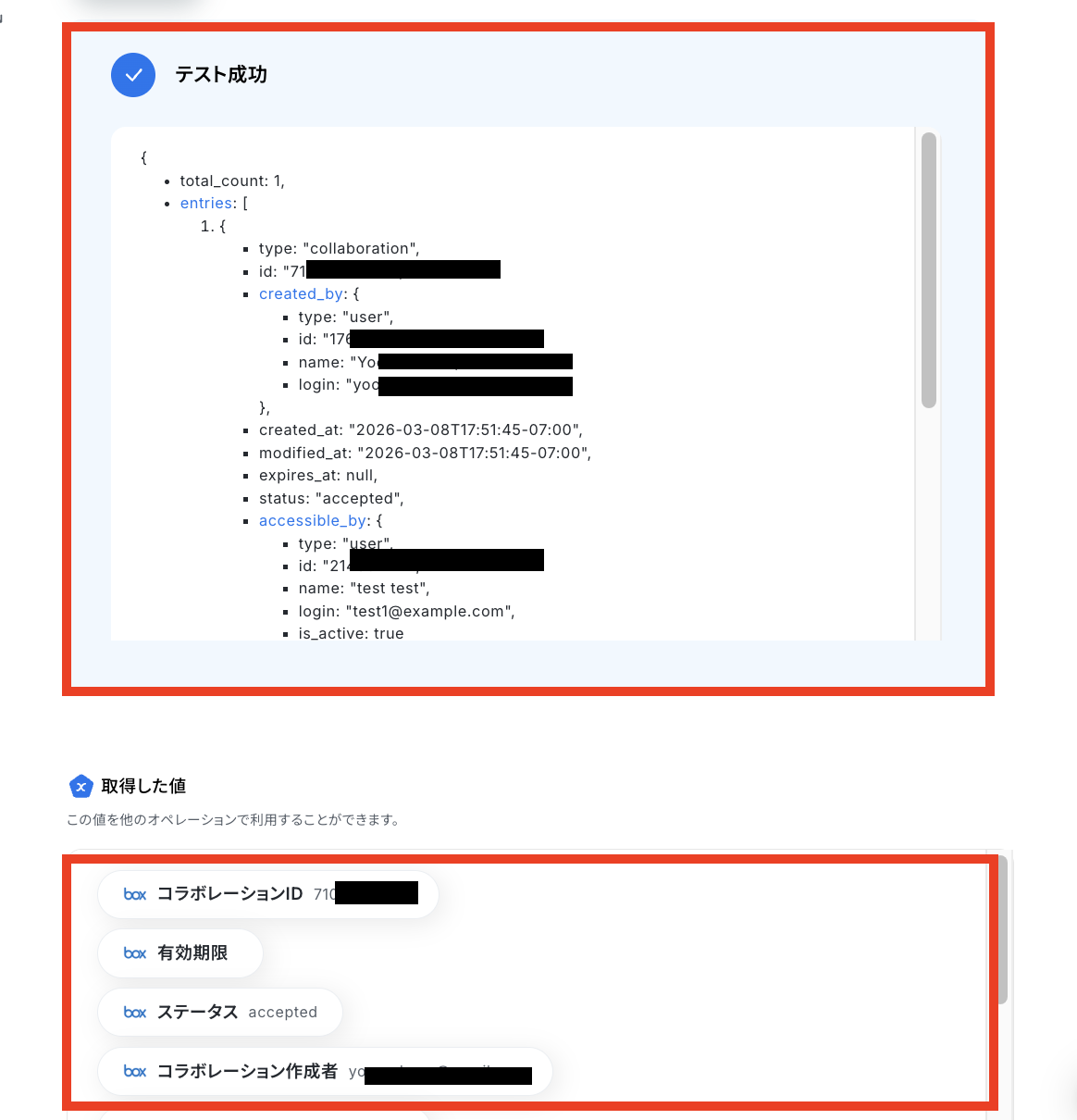 テストに成功すると、先ほど指定したフォルダのコラボレーション情報が「取得した値(※)」の欄に反映されるので、確認できたら「完了」をクリックしてください。 ※取得した値 とは? トリガーやオペレーション設定時に「テスト」を実行して取得した値のことです。 後続のオペレーション設定時の値として利用でき、フローボットを起動する度に変動した値 になります。