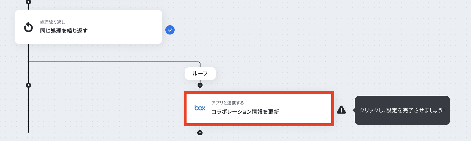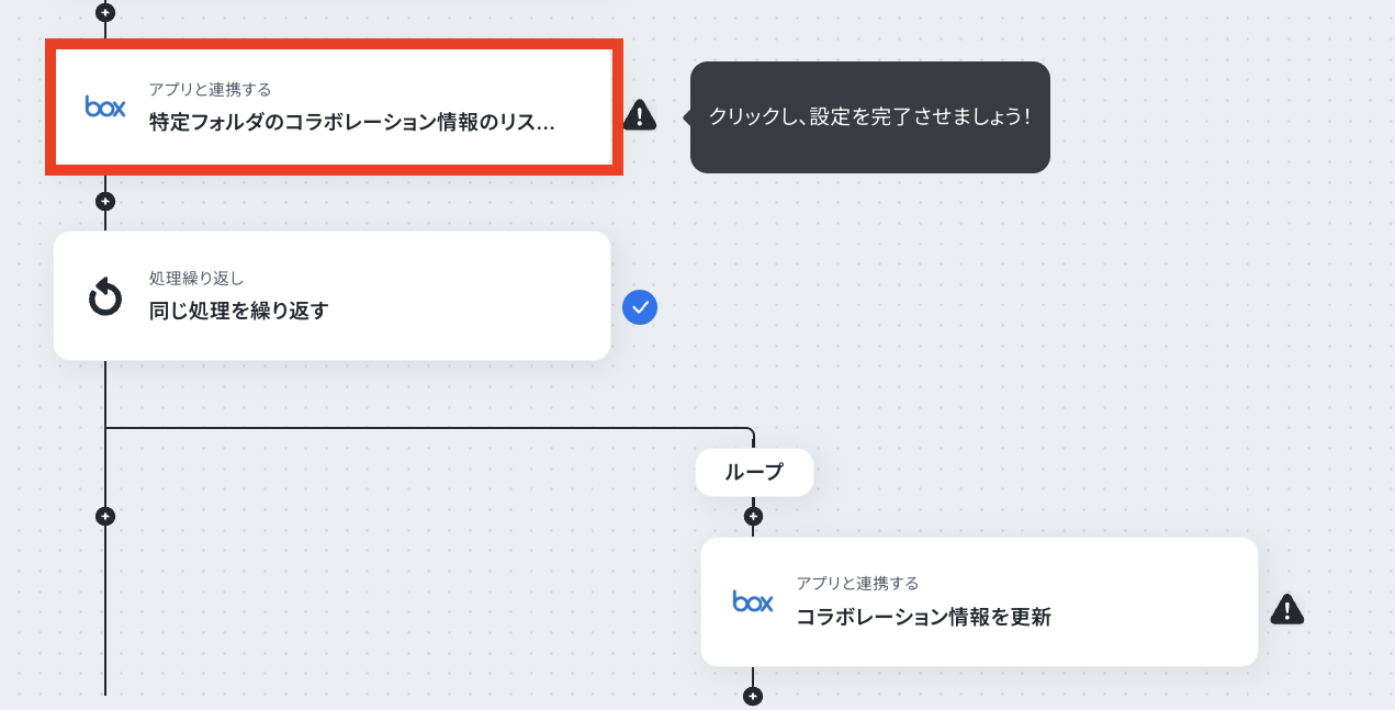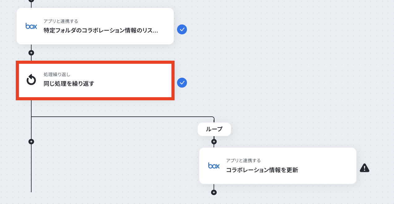 BoxとYoomを連携してください。 「同じ処理を繰り返す」オペレーションは、チームプラン・サクセスプランでのみご利用いただける機能となっております。フリープラン・ミニプランの場合は設定しているフローボットのオペレーションやデータコネクトはエラーとなりますので、ご注意ください。 チームプランやサクセスプランなどの有料プランは、2週間の無料トライアルを行うことが可能です。無料トライアル中には制限対象のアプリや機能(オペレーション)を使用することができます。