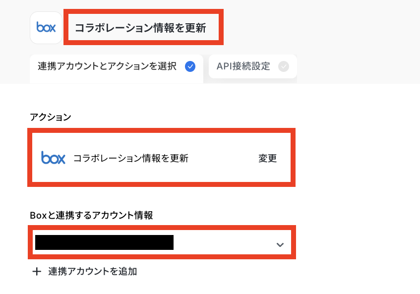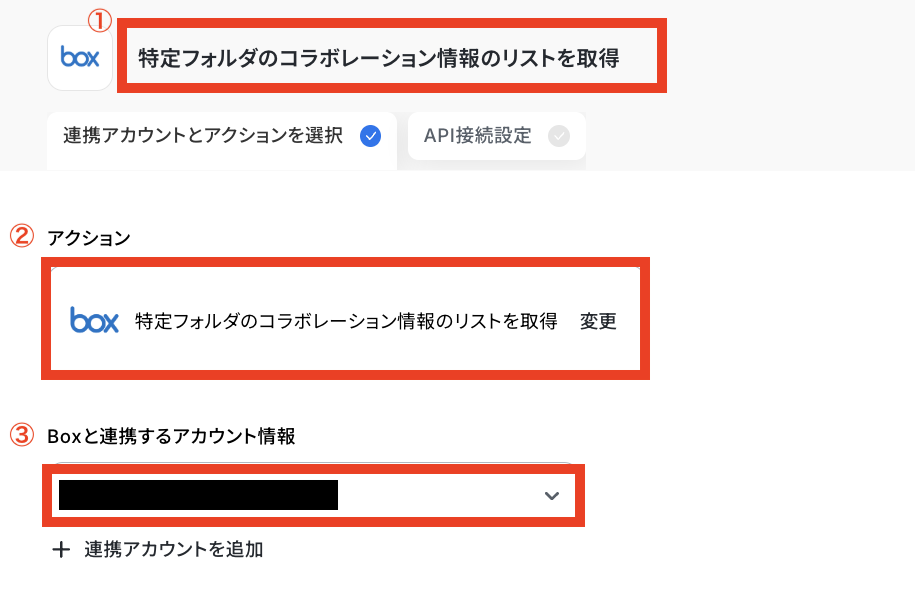 ②アクション:デフォルトで「特定フォルダのコラボレーション情報のリストを取得」が選択されているのでそのままで問題ありません! ③Boxと連携するアカウント情報:ステップ1で連携したアカウントが表示されていることを確認しましょう。
