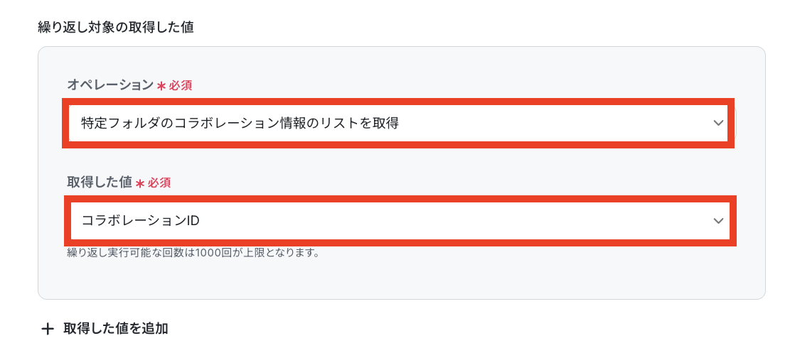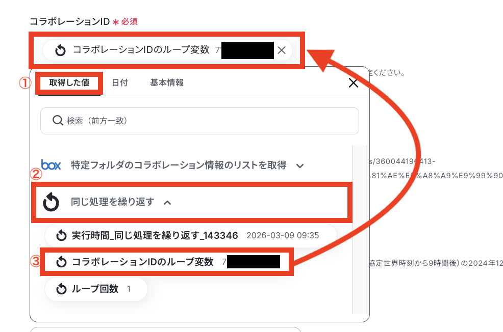 【取得した値を埋め込む方法】 ①入力欄をクリックして「取得した値」を表示 ②「同じ処理を繰り返す」をクリック ③「コラボレーションIDのループ変数」を選択