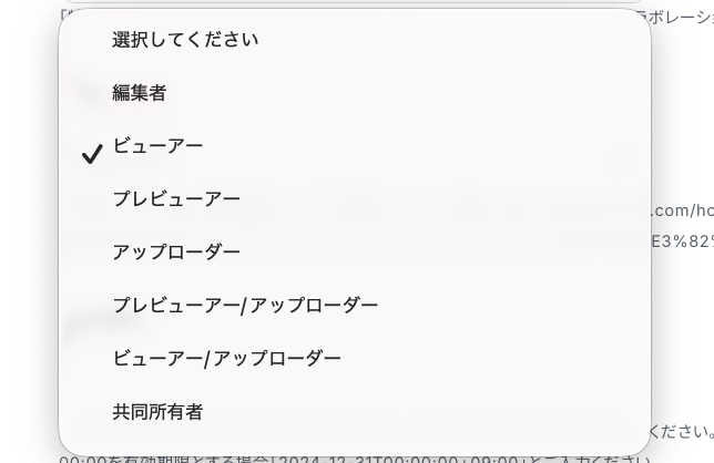 次に「権限」をプルダウンから選びます。 今回は「閲覧者」に変更したいので「ビューアー」を選びましょう。 (すでに「ビューアー」が反映されていれば、そのままでOKです!)