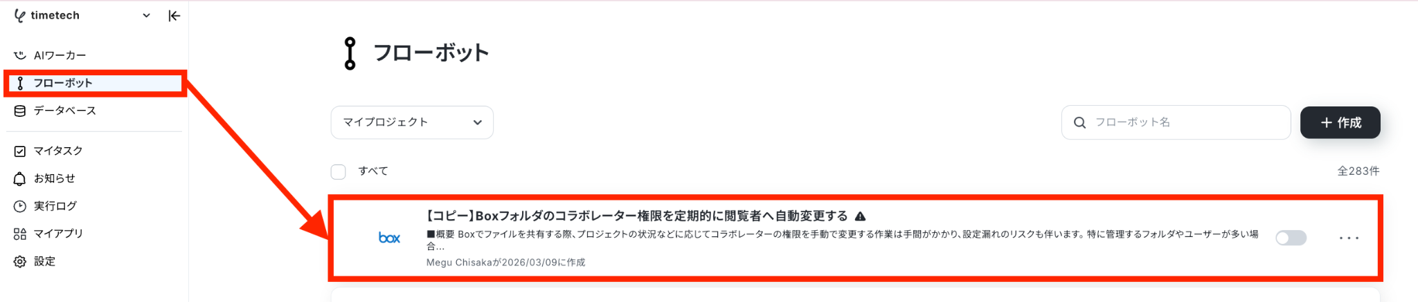 ステップ3:スケジュールトリガーの設定 左側にあるメニューの「フローボット」から、コピーしたテンプレートを開きます。 (※テンプレートをコピー後、すぐに設定する場合はテンプレートを開く操作は不要です。設定を中断した場合のみ「フローボット」から設定作業を再開してください!)