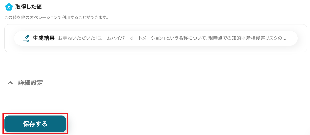 成功したら保存してください。ここで取得したアウトプットの値は次のステップで活用できます。