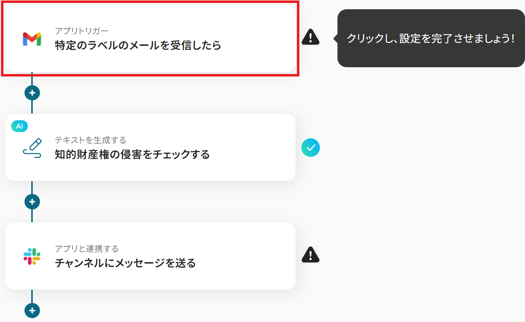 それではここから代表的な例として、Gmailで特定の条件に合致するメールを受信した際に、メール内容をAIが分析して知的財産権の侵害の可能性をチェックし、結果を指定したSlackチャンネルに自動で通知するフローを解説していきます!