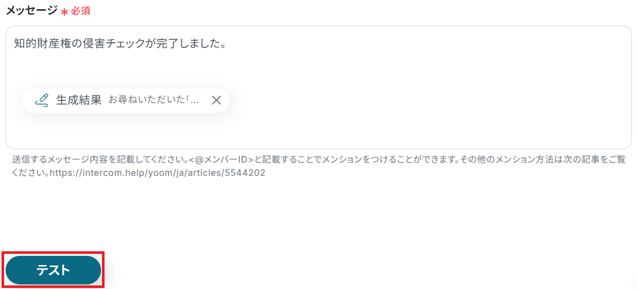最後に、連携したGmailアドレスに知的財産権の侵害チェック用テストメールを送信しましょう。受信したことを確認したらYoomの設定画面に戻ってテストします。