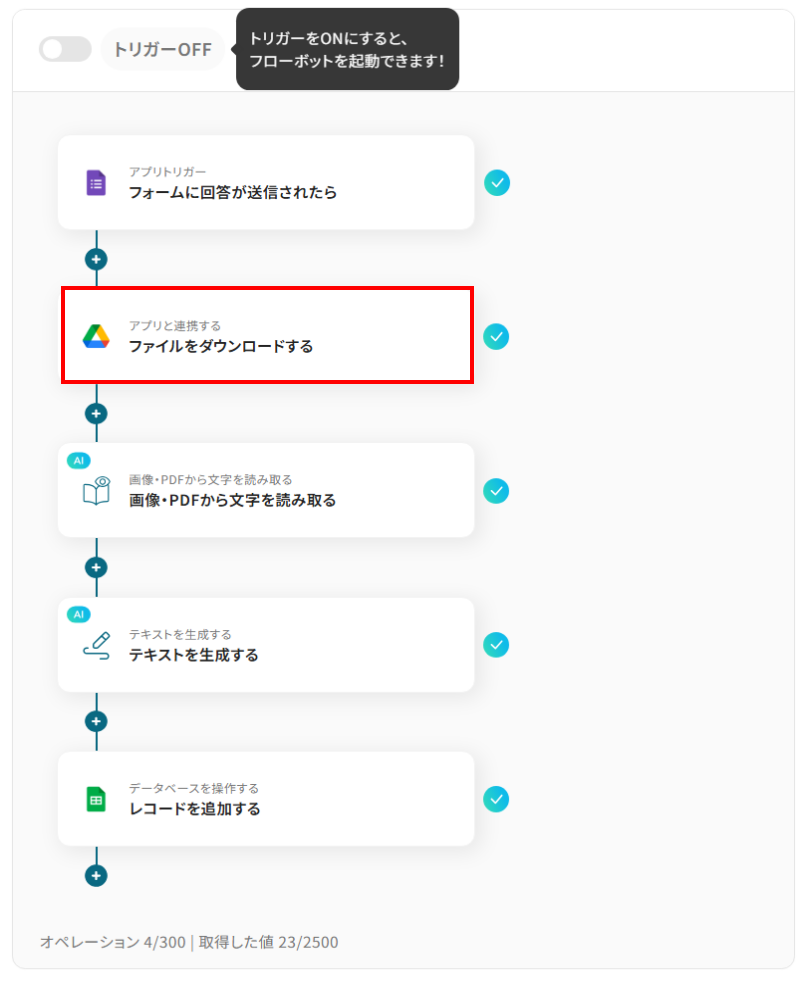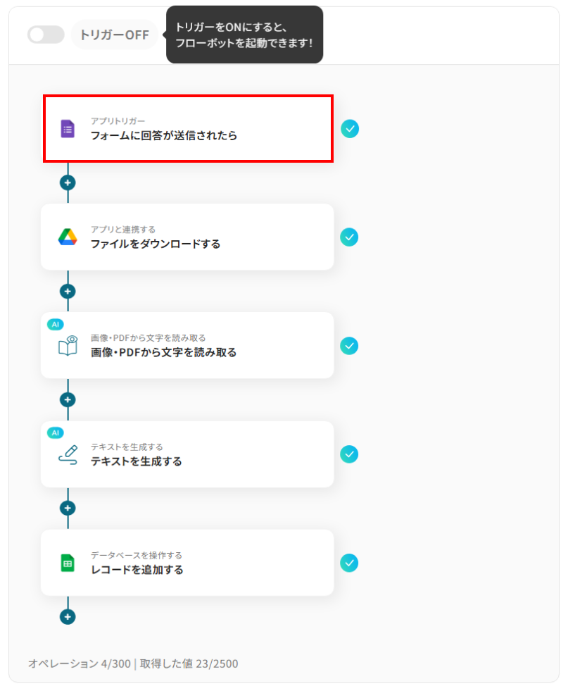 それではここから代表的な例として、Googleフォームから送信された書類をOCRで読み取り、AIで仕訳後、その結果をGoogle スプレッドシートに自動で追加するフローを解説していきます!