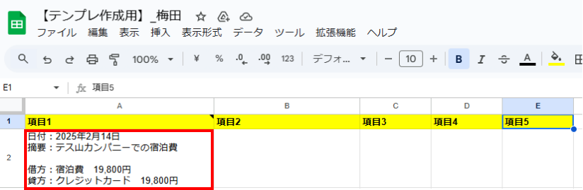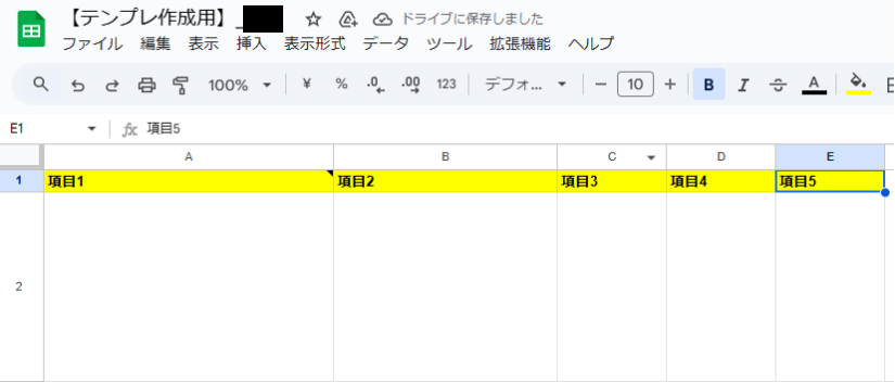 まだ対象のGoogle スプレッドシートを作成していない場合は、このタイミングで作ってください。今回は、下記のようなGoogle スプレッドシートを作ったので、こちらにレコードを追加する設定をしていきますね。