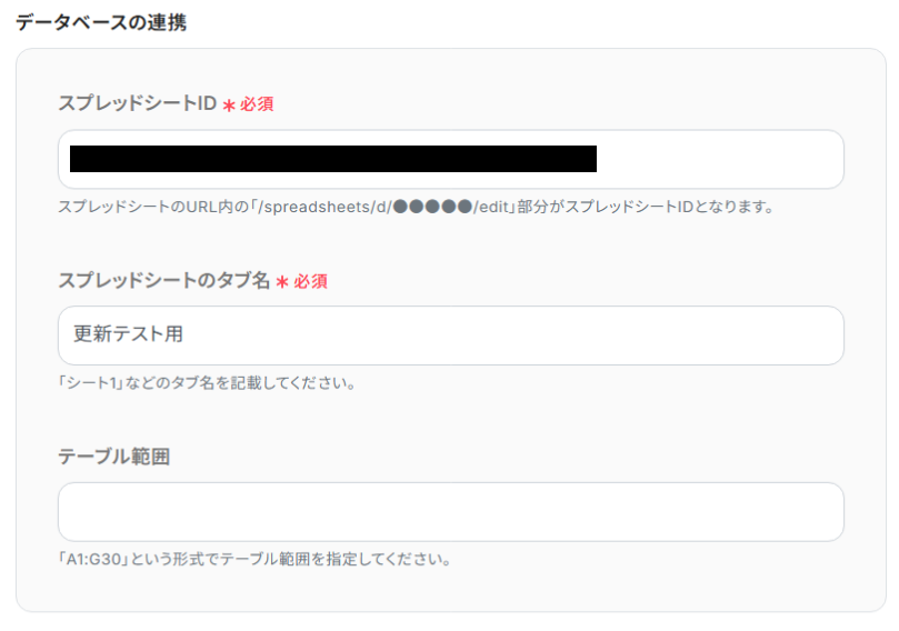 - スプレッドシートのタブ名:こちらも入力欄をクリックすると候補が表示されるので、対象のシートを選択してください。